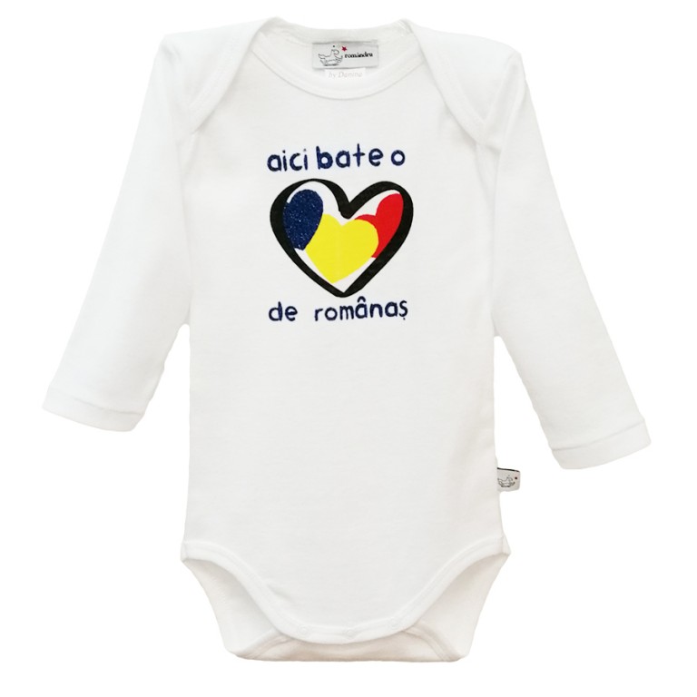 Esti in cautarea unui body bebelusi care este confectionat dintr-un material de bumbac fin, cu maneca lunga? Atunci, acest model de body bebe romanas este ideal pentru bebelusul tau. Are un mesaj haios „Aici bate o inima de romanas” care este ilustrat cu o inima colorata in nuantele rosu, galben si albastru. Este un body bebelusi foarte practic si comod, iar cele 3 capse se deschid si se inchid cu usurinta. Confortabilul body bebe romanas poate fi principala piesa de imbracaminte a unui bebelus cu varsta cuprinsa intre 18 luni si 3 ani.