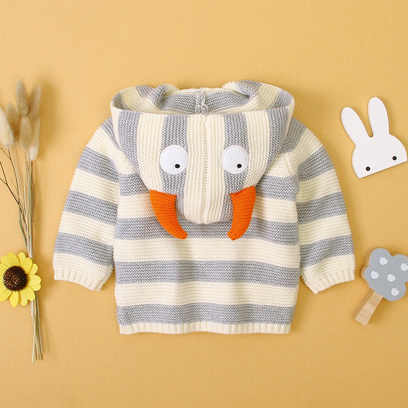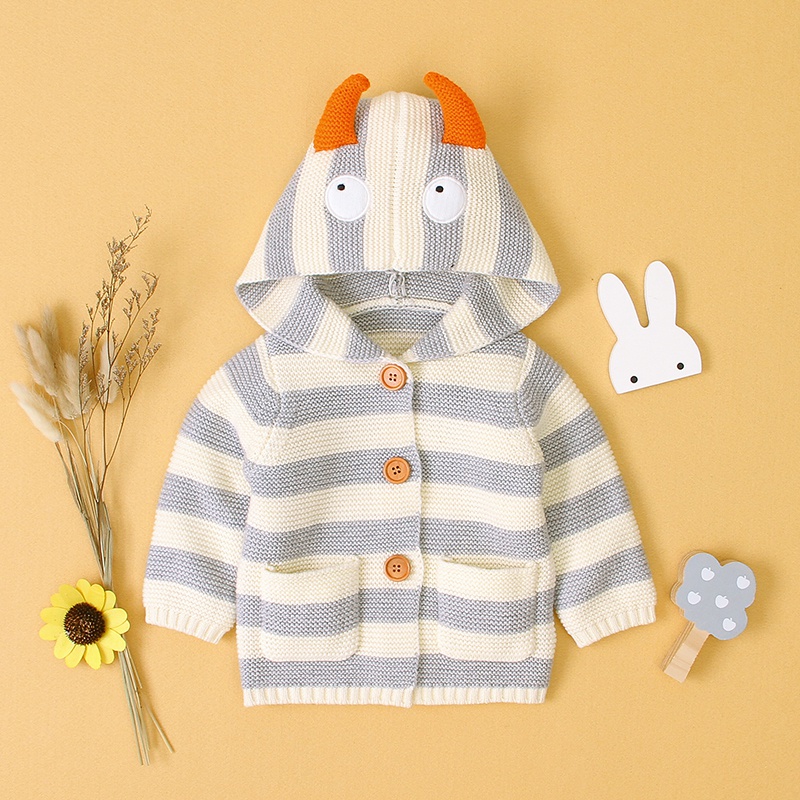 Zilele friguroase nu trebuie sa fie si mohorate! Alege haine care sa infrumuseteze orice zi rece, si care sa-i tina de cald bebelusului tau. Acest pulover tricotat cu gluga pentru bebe are model in dungi cu un colorit neutru care insufla o stare de calm. Se inchide cu nasturi mari si frumos colorati, asortati cu detaliile haioase de pe gluga. Puloverul prezinta buzunare in partea frontala, acestea fiind niste amanunte importante care dau o subtila nota de eleganta acestui articol vestimentar.