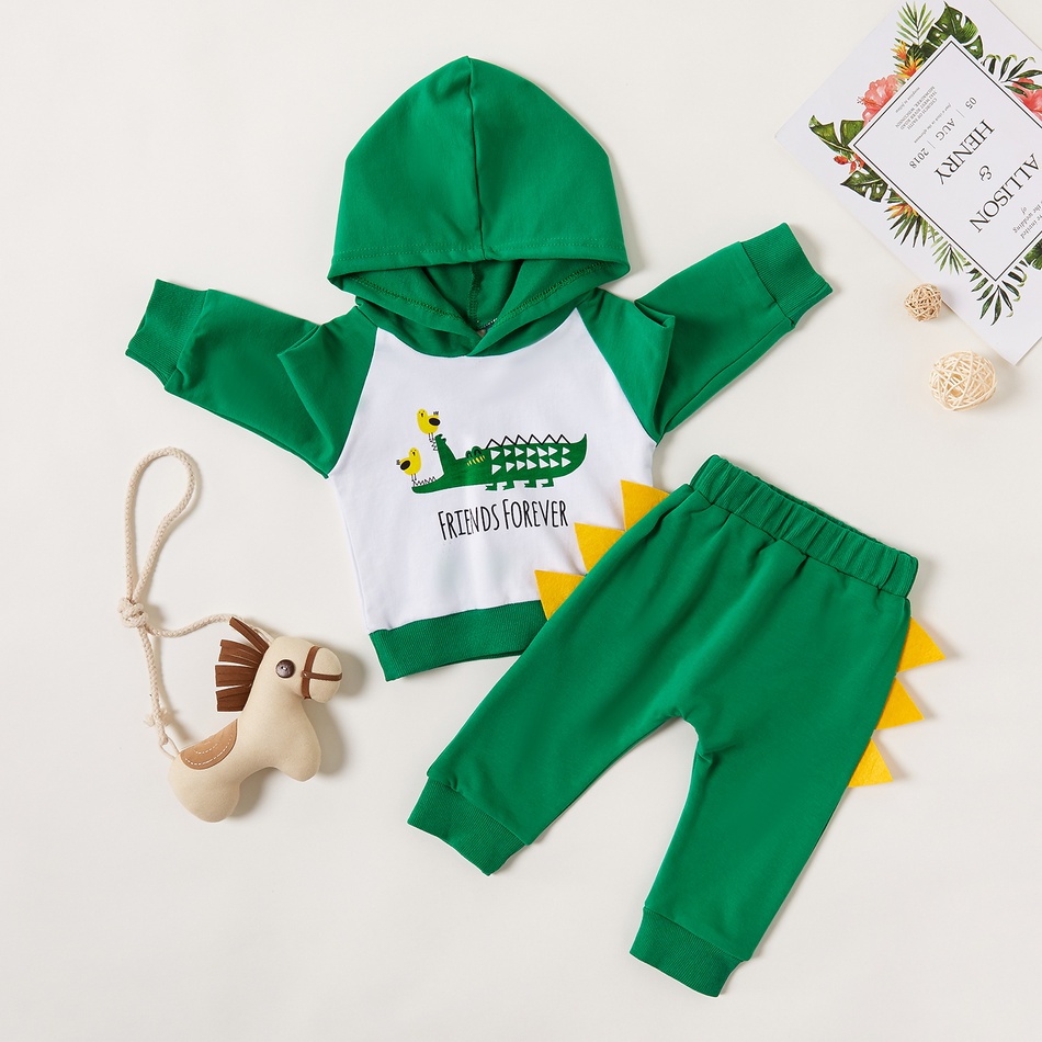 Seturile din doua piese sunt grozave pentru bebelusi! Ele sunt gata asortate, asa ca nu mai trebuie sa-ti bati capul cu potrivirea culorilor. Acest set Friends forever pentru baieti are culori placute si un imprimeu vesel cu un crocodil si doua pasarele. Hanoracul cu maneci lungi si gluga are croi lejer si decolteu in V care usureaza imbracarea si dezbracarea. Pantalonii au banda elastica in talie si la glezne, asigurand confort si astfel bebelusul se poate misca in voie. Detaliile galbene in forma de solzi de pe laterale sunt un amanunt care denota veselie. Ambele articole sunt confectionate 100% din bumbac.