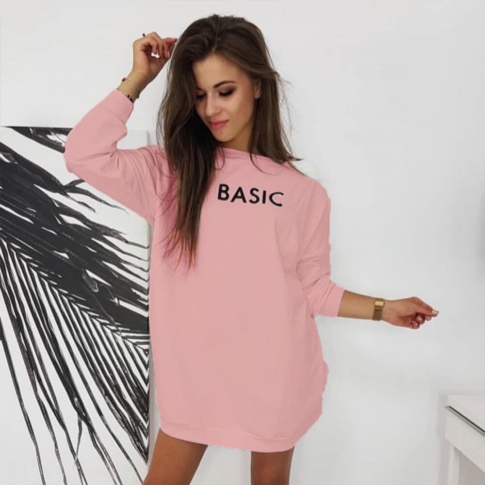 Care este cea mai comoda si fashion tinuta din bumbac pe care o preferi? Cu o croiala dreapta si maneca lunga, modelul nou de rochie sport are un imprimeu-text “BASIC”. Nuanta de roz prafuit este una foarte cautata, deoarece ii acorda celei care o poarta un aer de eleganta, feminitate si este usor de combinat. O poti purta atat cu tocuri stiletto fine si o geaca de blugi oversized, dar si cu tenesi/bocanci si un palton gri, negru sau alb.