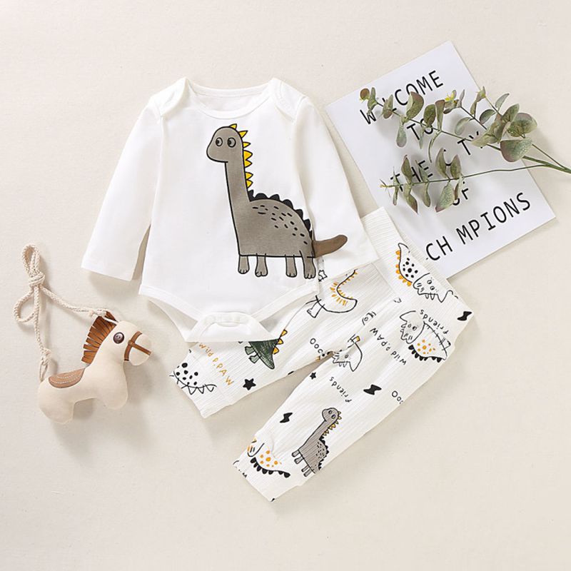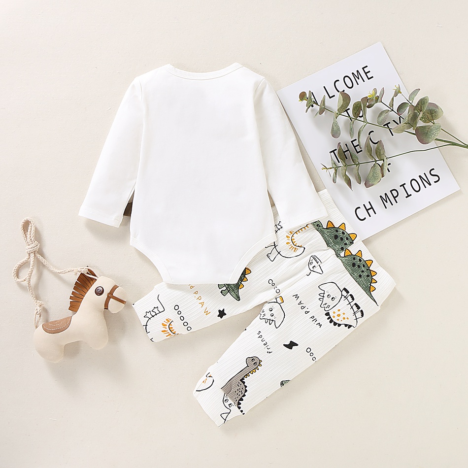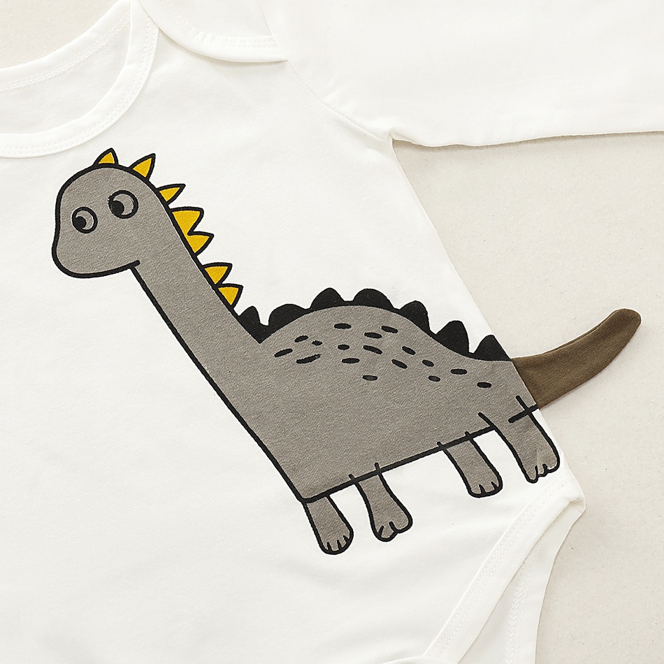 Imagineaza-ti micul bebelus imbracat in acest set deosebit de dragalas! Te face sa zambesti, nu-i asa? Setul micul dinozaur pentru bebe este compus dintr-un body cu maneca lunga si o pereche de pantaloni lungi. Body-ul alb cu imprimeu dinozaur are decolteu rotund si inchidere cu capse, ceea ce faciliteaza dezbracarea si imbracarea. Pantalonii au banda elastica in talie si la glezne, asezandu-se confortabil pe corp, si imprimeu haios cu diferite specii de dinozauri. Acest set micul dinozaur pentru bebe este confectionat din bumbac 100%, pentru a proteja pielea delicata a micutului si a o lasa sa respire.